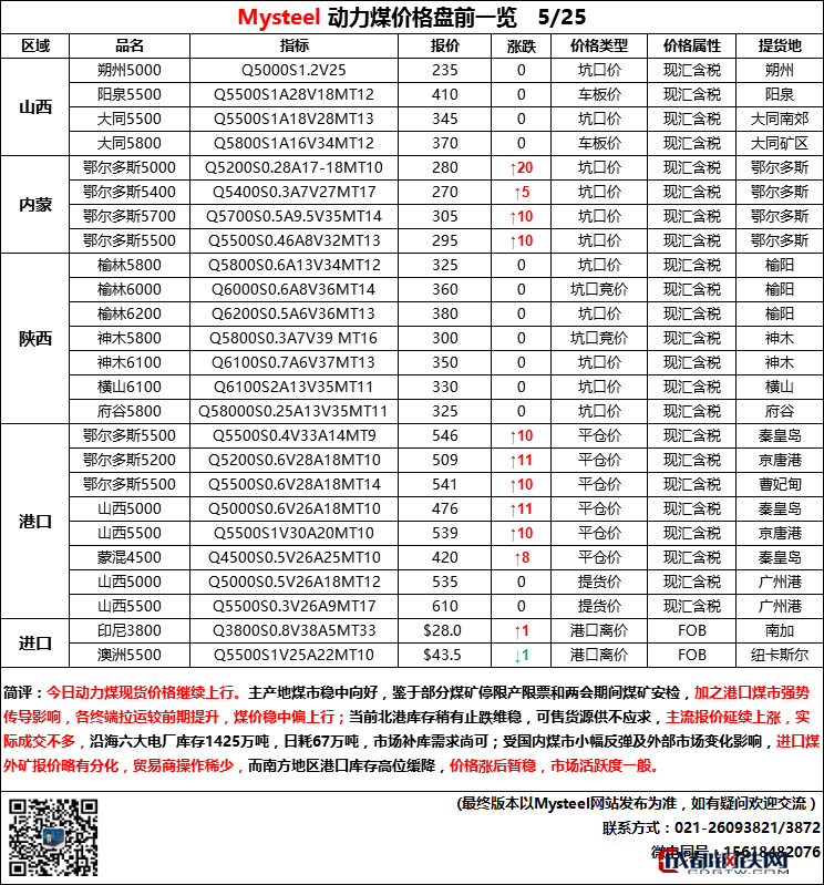 25日動力煤現(xiàn)貨交易價盤前一覽