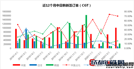 據(jù)克拉克松數(shù)據(jù)統(tǒng)計(jì),4月份中國船廠接獲新船訂單1007041CGT;日本船廠接獲新船訂單54519CGT;韓國船廠新船訂單接獲232211CGT。修正總噸分別占全球新船訂單量的70.17%、3.80%和16.18%;CGT占比環(huán)比3月分別下跌3.81%、下跌8.13%和上升4.88%,與2019年4月相比分別同比上升18.60%、下跌11.35%和下跌8.39%。