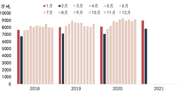 圖2:2021年1-2月粗鋼產(chǎn)量再創(chuàng)新高 2021年1、2月份中國粗鋼產(chǎn)量分別為8959萬噸、7823萬噸,超越往年同期。在下游需求旺盛,且減產(chǎn)具體政策尚未出臺的情況下,一季度粗鋼產(chǎn)量將會繼續(xù)維持高位。但周日工信部公布今年將落實更嚴(yán)格的減排措施,隨著減產(chǎn)政策的逐步落地,產(chǎn)量下降或在二、三季度陸續(xù)出現(xiàn)。