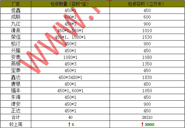 唐山156座高爐中40座檢修,較上周增5座;檢修容積26210立方米,較上周同期增多3960立方米。
