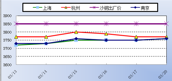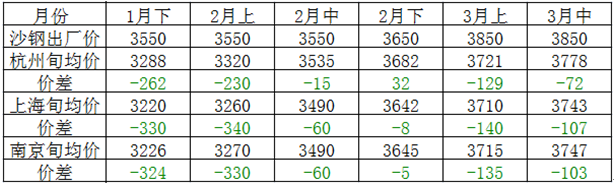 3月中旬市場鋼價偏強(qiáng)震蕩,但整體漲跌幅均不大,主要原因還是現(xiàn)在市場受期螺現(xiàn)象影響比較大,現(xiàn)貨多跟隨期貨窄幅波動。具體數(shù)據(jù)顯示,截至目前為止,杭州地區(qū)庫提價格約3780左右,而上海廠提價格約為3760,南京廠提基價約3750左右,旬內(nèi)江浙滬主導(dǎo)城市沙鋼均價大約在3745元/噸左右,而沙鋼上旬指導(dǎo)價為3850元/噸,倒掛幅度相比上旬有所減緩,旬內(nèi)具體價格走勢詳情如下圖所示。
