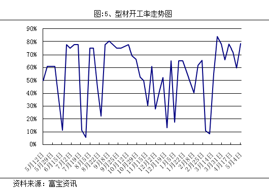 型材:本周型材市場整體偏強(qiáng)運(yùn)行。從五一小長假之前到現(xiàn)在,型材市場價(jià)明顯上升,主流唐山市場工角槽價(jià)格累計(jì)漲幅普遍在100-200元/噸之間。從四月下旬開始,之前連續(xù)下跌的行情走勢就開始得到了抑制,并逐步走高向好。在漲至高位后,本周鋼坯走勢顯得有點(diǎn)震蕩調(diào)整,但型材價(jià)格拉漲上行的態(tài)勢并沒有改變。綜合而言,本周型市繼續(xù)偏強(qiáng)運(yùn)行,行情走勢良好。從目前市場狀況來看,要想繼續(xù)持續(xù)上行,還是有點(diǎn)缺乏動力,偏弱調(diào)整的態(tài)勢已經(jīng)出現(xiàn)。