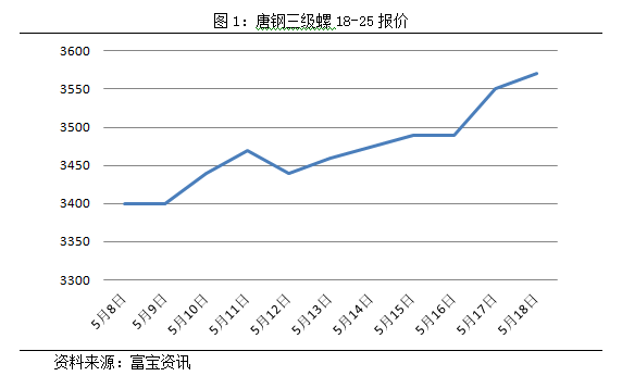 成都鋼鐵網(wǎng)資訊5月19日消息: 進(jìn)入5月份后,炒漲最熱的還是“一帶一路會(huì)議”。2017“一帶一路”國際合作高峰論壇于5月14日-5月15日在北京舉行。多個(gè)國家的元首和政府首腦、聯(lián)合國等高管將出席會(huì)議,受此影響,天津地區(qū)酸洗等廠家全部停產(chǎn)。唐山政府于5月9日至31日分三個(gè)階段來進(jìn)行環(huán)保整治,11-25日重點(diǎn)整治階段,嚴(yán)格按照排污標(biāo)準(zhǔn),對(duì)燃煤鍋爐、重型柴油車等實(shí)行專項(xiàng)整治,不達(dá)標(biāo)停產(chǎn),并實(shí)行處罰。10日上報(bào)排放不達(dá)標(biāo)企業(yè),11日零時(shí)開始停產(chǎn)整治。13日零時(shí)至16日24時(shí),大宗貨物實(shí)行錯(cuò)峰運(yùn)輸統(tǒng)籌。環(huán)保限產(chǎn)之風(fēng)再次刮起,引唐山市價(jià)炒漲。以唐鋼三級(jí)螺為例,如圖1所示,從月初到昨日震蕩拉漲。下旬已至,漲勢能否依舊,請(qǐng)隨筆者來梳理。