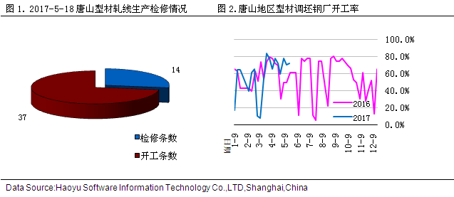 唐山型材鋼廠開工率小幅上升。據(jù)成都鋼鐵網(wǎng)5月18日統(tǒng)計,34家型廠51條生產(chǎn)線開工27條,較上周增加1條,開工率為72.55%,較上周上升了1.96%。 三、市場庫存概覽