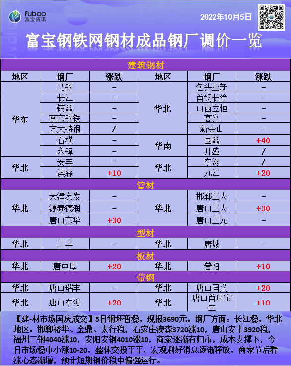【帶鋼】唐山熱帶時訊:唐山窄帶主穩(wěn)個漲10,整體成交一般尚可,部分可出清日產(chǎn);285-355系市場裸價現(xiàn)貨3655-3690(主流3670)宏興3675宏興期貨3665-3670,現(xiàn)貨較昨晨價漲20。十一小長假中后期市場交投漸活躍,下游多按需補庫為主。加上外盤及原油影響,鋼貿(mào)商對于節(jié)后盤面走勢預期尚可,多挺價出貨為主??紤]成本支撐,料帶鋼仍偏強調(diào)整。
