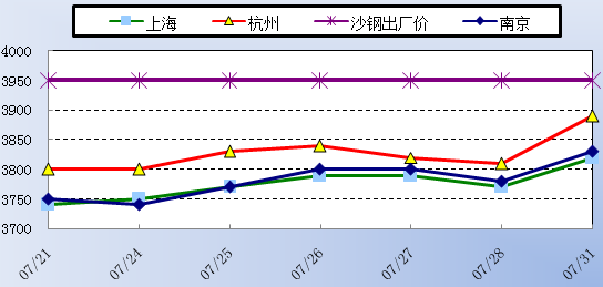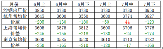 內(nèi)江浙滬主導(dǎo)城市沙鋼均價大約在3780元/噸左右,而沙鋼上旬指導(dǎo)價為3950元/噸,旬內(nèi)具體情況如下圖所示。