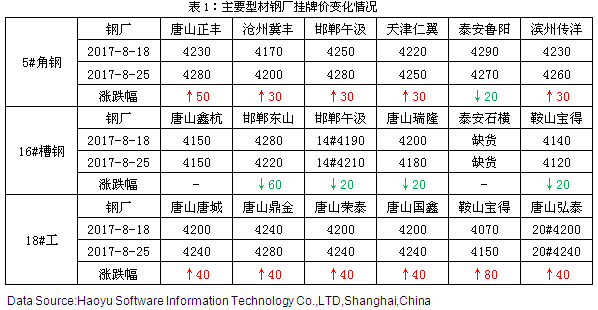 成都鋼鐵網(wǎng)資訊8月25日消息: 本周焦點:對于后期市場,多數(shù)商家及鋼廠普遍認為鋼坯可能會漲到3900元/噸左右,所以型材市場還有一定的上漲空間。再加上當下市場環(huán)保炒作因素還在,市場普遍不愿意降價,以看漲為主。而且鋼坯價格雖然有上下震蕩,但整體的趨勢還是較強的,對于型材的成本支撐依然有力。綜合預計下周型材市場還是偏強運行。 【內(nèi)容提要】 ◆本周型鋼市場:型市震蕩調(diào)整,行情表現(xiàn)尚可 ◆唐山型材軋線開工率小降 ◆市場庫存變動不大 ◆型廠理論盈利空間繼續(xù)擴大 ◆預計下周型市還是偏強運行 一、市場行情回顧
