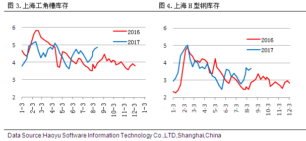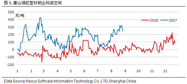 據(jù)2017年9月1日對(duì)上海市場(chǎng)型材倉庫進(jìn)行的同口徑調(diào)查統(tǒng)計(jì)顯示,工角槽庫存4.87萬噸,較上周持平,H型鋼庫存3.68萬噸,較上周持平。 四、鋼廠盈利空間分析
