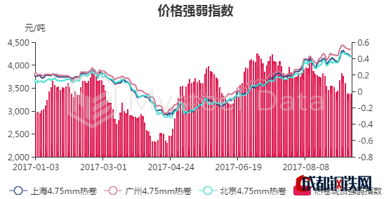 北京市場4.75mm熱卷價(jià)格為4200元/噸。據(jù)了解,今日開市,期卷1801合約沖高回落,在此影響之下,貿(mào)易商紛紛謹(jǐn)慎觀望;據(jù)貿(mào)易商反饋,本周鋼廠資源陸續(xù)到貨,截止到9月13日,據(jù)本網(wǎng)不完全統(tǒng)計(jì),社會(huì)庫存總量約為6.3萬噸,較上周小幅增加;綜合考慮,市場熱軋板卷價(jià)格大幅下跌,鋼廠近兩天挺價(jià)意愿強(qiáng)烈,貿(mào)易商報(bào)價(jià)多以穩(wěn)為主。