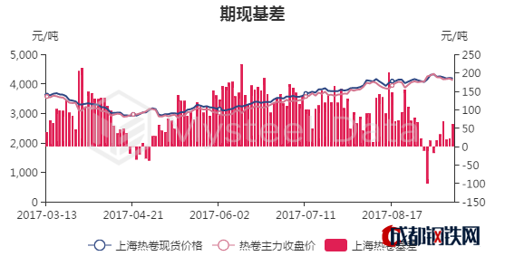 9月13日熱卷主力收盤價(jià)為4180元/噸,期現(xiàn)基差為61元/噸