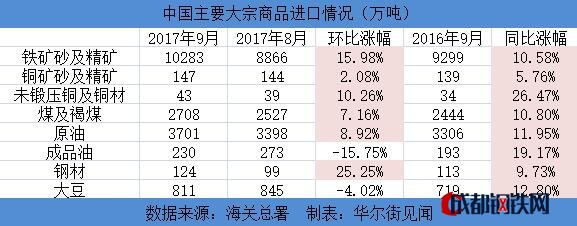 與8月比較,除了成品油和大豆外,鐵礦砂、銅礦砂、銅材、煤、鋼材、原油均環(huán)比增長。