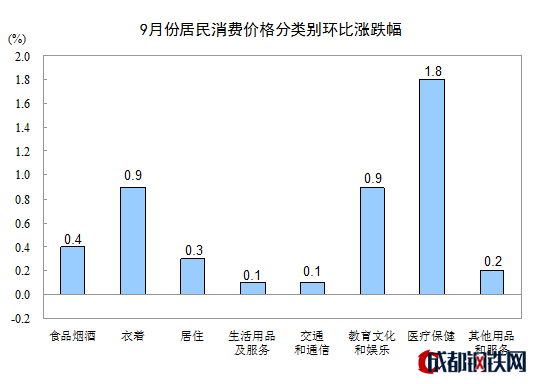 二、各類商品及服務價格環(huán)比變動情況9月份,食品煙酒價格環(huán)比上漲0.4%。其中,蛋類價格上漲5.3%,影響CPI上漲約0.03個百分點;鮮果價格上漲1.9%,影響CPI上漲約0.03個百分點;畜肉類價格上漲0.9%,影響CPI上漲約0.04個百分點(豬肉價格上漲1.0%,影響CPI上漲約0.03個百分點);水產(chǎn)品價格下降1.8%,影響CPI下降約0.03個百分點。9月份,其他七大類價格環(huán)比均有不同程度的上漲。其中,醫(yī)療保健、居住、交通和通信價格分別上漲1.8%、0.3%和0.1%,其他用品和服務、生活用品及服務價格分別上漲0.2%和0.1%;衣著、教育文化和娛樂價格均上漲0.9%。