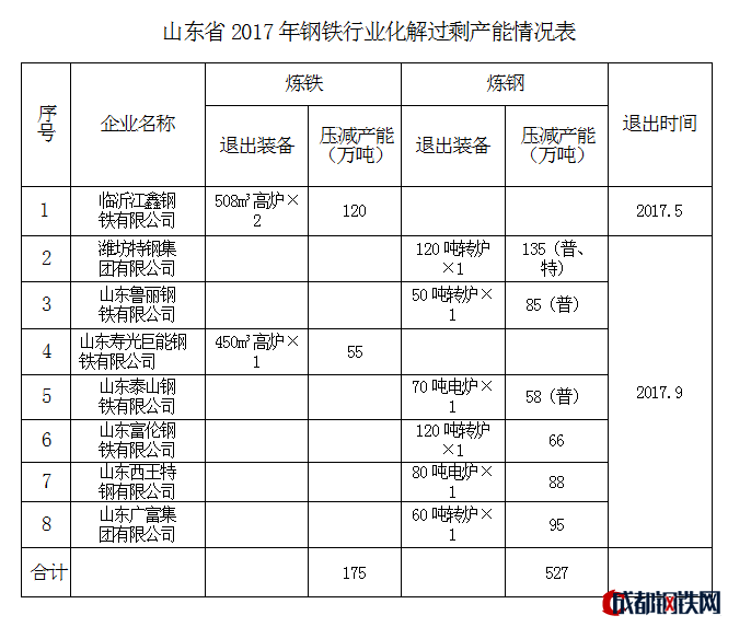 近日,山東省山東省經(jīng)濟和信息化委員會印發(fā)《山東省2017年鋼鐵行業(yè)化解過剩產(chǎn)能情況公告》,根據(jù)《山東省2017年鋼鐵行業(yè)化解過剩產(chǎn)能情況公 告》,山東省2017年化解過剩產(chǎn)能的目標計劃為生鐵175萬噸、粗鋼527萬噸。到2017年9月底,山東省有關(guān)去產(chǎn)能設(shè)備已全部關(guān)停退出,完成去產(chǎn)能 任務(wù)。10月11日山東省鋼鐵行業(yè)化解過剩產(chǎn)能領(lǐng)導小組辦公室已組織省直有關(guān)部門,在市縣(區(qū))政府驗收的基礎(chǔ)上,對有關(guān)企業(yè)去產(chǎn)能情況進行了檢查驗收。2017年山東省化解過剩產(chǎn)能情況表如下所示——