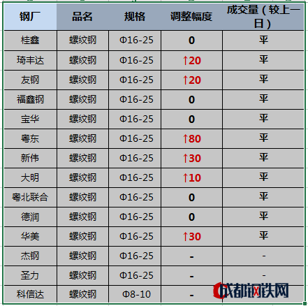 周末至今日,本網(wǎng)統(tǒng)計(jì)的華南區(qū)域14家民營(yíng)鋼廠鋼材出廠價(jià)繼續(xù)上調(diào),今日價(jià)格繼續(xù)上漲10-80元/噸,福鑫、德潤(rùn)、圣力、科信達(dá)今日仍未開(kāi)始報(bào)價(jià)。對(duì)于明日價(jià)格走勢(shì),多數(shù)民營(yíng)鋼廠表示持穩(wěn)為主。外圍相關(guān)信息參考: