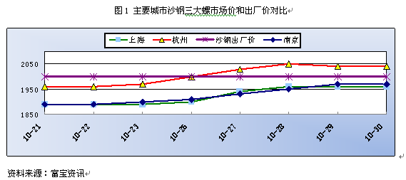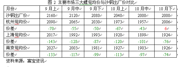 雖時(shí)值月末,但周初央行降息提振信心,加之市場資源緊俏現(xiàn)象明顯,故本周主流價(jià)位高靠,然漲后成交跟進(jìn)放緩,加之陰雨天氣影響,續(xù)漲動(dòng)能不足,漸趨于平穩(wěn)。截至目前,就三級(jí)大螺紋來說,沙鋼10月下旬價(jià)2000元/噸,當(dāng)前江浙滬地區(qū)主流價(jià)位在1990元/噸左右,市價(jià)倒掛幅度明顯收窄,倒掛10元/噸,如(圖1)。