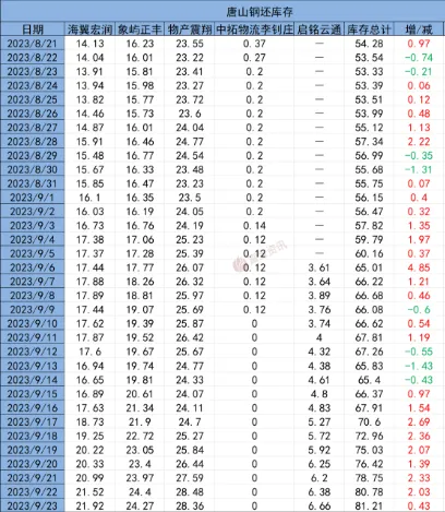 唐山鋼坯庫存總計(jì)81.21萬噸,較昨增加0.43萬噸,其中:海翼宏潤昨入庫0.82出庫0.42,現(xiàn)庫存21.92萬噸;象嶼正豐昨入庫0.48出庫0.61,現(xiàn)庫存24.27萬噸;物產(chǎn)中大昨入庫0.63出庫0.75,現(xiàn)庫存28.36萬噸;啟銘云通昨入庫0.52出庫0.24,現(xiàn)庫存6.66萬噸。