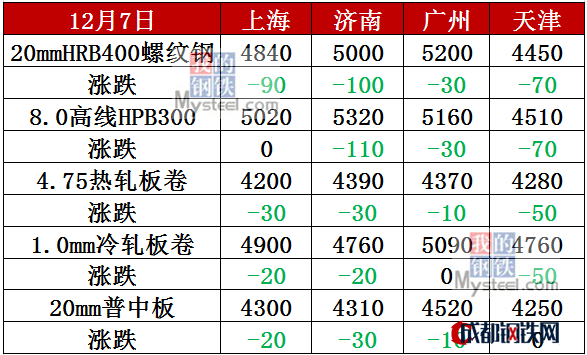 12月7日,全國鋼材市場價格跌幅明顯。上海、杭州、廣州、武漢、京津冀、成都、西安等19個市場20mm螺紋鋼價格下跌10—110元。4.75熱軋板卷市場價格弱勢下行,上海、濟南、福州、京津冀、沈陽、成都、西安等20個市場價格下跌10—100元。20mm中厚板市場價格小幅下跌。上海、杭州、濟南、廣州、武漢、北京、沈陽、西安等18個市場價格下跌10—70元。