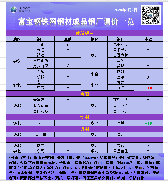 花紋板基價(jià)4100,以上為基礎(chǔ)價(jià),個(gè)別型號(hào)有加價(jià),終端需求釋放不連續(xù),普遍以少量補(bǔ)庫(kù)為主,預(yù)計(jì)短期價(jià)格穩(wěn)中整理?!局邪濉?日華北中板弱穩(wěn)運(yùn)行,唐山4000穩(wěn),武安3980跌20,本周鋼廠利潤(rùn)持續(xù)收窄,鋼廠檢修雖陸續(xù)復(fù)產(chǎn),但產(chǎn)量仍維持低位,淡季需求不斷萎縮,貿(mào)易商囤貨意愿不強(qiáng),實(shí)際成交情況表現(xiàn)偏弱,市場(chǎng)供需矛盾仍未改善,考慮目前成本端仍存支撐,料明日中板價(jià)格主穩(wěn)觀望?!拘筒摹?日唐山型材穩(wěn)中有弱。角5-6.3#3980;槽8-16#3970;工14-20#4020跌10?,F(xiàn)貨市場(chǎng)多空交織影響下,商家操作上以出貨為主,成交多集中在低位資源,后市情緒偏謹(jǐn)慎,淡季終端需求持續(xù)縮減,下游采購(gòu)企業(yè)拿貨積極性不高,供需矛盾未有明顯改善。預(yù)計(jì)明日型價(jià)將守穩(wěn)觀望。【帶鋼】7日唐山熱帶時(shí)訊:唐山145系窄帶主穩(wěn)個(gè)降10報(bào)3910含稅出廠,整體成交偏弱;285-355系市場(chǎng)裸價(jià)現(xiàn)貨3615-3630(主流3615)宏興3618宏興期貨3620-3625,現(xiàn)貨較昨午后收盤價(jià)變動(dòng)不大。周末市場(chǎng)交投氛圍清淡,貿(mào)易商操作積極性不高,且下游買漲不買跌,多觀望為主。目前市場(chǎng)淡季效應(yīng)明顯,帶鋼累庫(kù)銷售壓力加大。但考慮預(yù)期仍有支撐,預(yù)計(jì)帶鋼或弱穩(wěn)盤整?!就垮儭?日涂鍍主流價(jià)格小幅偏弱調(diào)整,博興市場(chǎng)彩基價(jià)格下調(diào),幅度在10-20元左右,0.35*1000不含稅報(bào)價(jià)4130,較上一日下跌10元,0.4*1000不含稅報(bào)價(jià)4100,較上一日下跌10元,周末市場(chǎng)多休市,整體活躍度不高,下游僅有年前收尾項(xiàng)目采購(gòu),需求并無(wú)明顯回暖,成交表現(xiàn)冷清,預(yù)計(jì)明日價(jià)格窄幅震蕩為主?!竟懿摹?日唐山管材價(jià)格穩(wěn)中偏弱。唐山主流