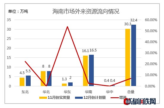 3、12月份海南地區(qū)建筑材區(qū)內(nèi)計劃供應量共計32.4萬噸,環(huán)比11月份增加2.1萬噸,增幅為6%;其中資源增加主要集中在東北及華東區(qū)域,東北區(qū)域環(huán)比11月份增加1萬噸,增幅為22%,華東區(qū)域環(huán)比11月份增加0.7萬噸,增幅為53%。