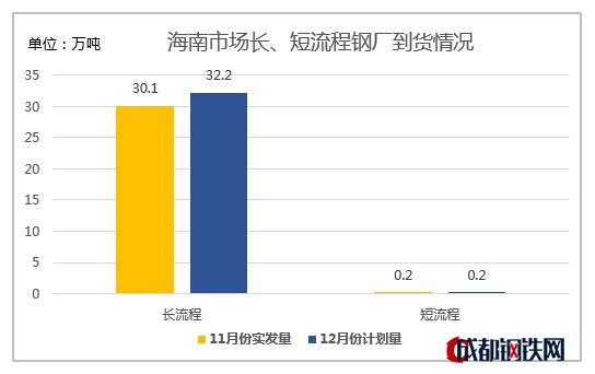 1、12月海南地區(qū)建筑鋼材長流程鋼廠供應量共計32.2萬噸,環(huán)比11月份增加增加2.1萬噸,增幅6%;短流程鋼廠到貨量為0.2萬噸,環(huán)比11月份基本持平。