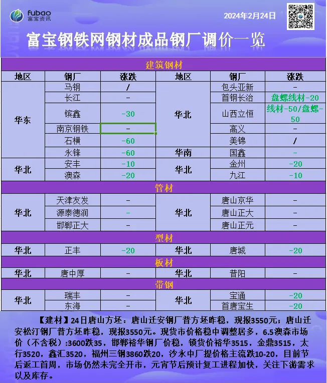 花紋板基價4010跌20,以上為基礎(chǔ)價,個別型號有加價。當(dāng)前市場需求不足,商家操作上出貨為主,整體成交一般,預(yù)計明日價格弱穩(wěn)運行?!就垮儭拷袢胀垮冎髁鲀r格持穩(wěn)運行,個別調(diào)整,博興市場彩基價格穩(wěn)跌10元,0.35*1000不含稅報價4100,較上一交易日持穩(wěn),0.4*1000不含稅報價4060,較上一交易日跌10,期卷震蕩頻繁,對現(xiàn)貨市場存在一定的影響,目前市場下游開工仍未恢復(fù),成交表現(xiàn)差,加上今天元宵節(jié),市場節(jié)日氣氛濃厚,預(yù)計明日價格穩(wěn)中調(diào)整為主。【管材】今市場元宵佳節(jié)休市較多,整體成交情況偏弱,昨夜盤影響商家看空情緒加劇,但下游開工在即,商家多穩(wěn)價觀望,短期成本端趨弱,支撐松動,預(yù)計周末管市區(qū)弱穩(wěn)調(diào)整 四、鋼廠調(diào)價