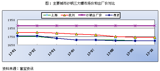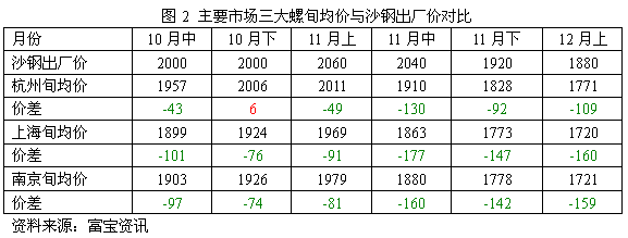 時(shí)值月初,資金壓力緩解,且天氣好轉(zhuǎn),部分低位成交略好轉(zhuǎn),跌幅有所收窄,但供需矛盾影響下,鋼價(jià)跌勢(shì)未改。截至目前,就三級(jí)大螺紋來說,沙鋼12月上旬價(jià)1880元/噸,當(dāng)前江浙滬地區(qū)主流價(jià)位在1713元/噸左右,市價(jià)倒掛幅度增加,倒掛167元/噸,如(圖1)。
