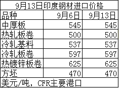 9月13日印度鋼材進口價格