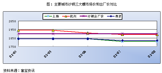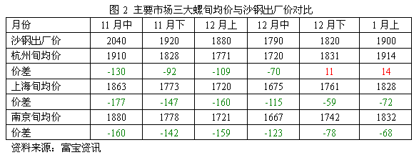 鋼廠上旬政策趨高,且資源緊俏,故價相對堅挺,但隨著成交遲遲不見好轉(zhuǎn),以及坯料沖高回落,下挫市場信心,旬內(nèi)主流價位有所松動。截至目前,就三級大螺紋來說,沙鋼1月下上旬價1900元/噸,當前江浙滬地區(qū)主流價位在1840元/噸左右,市價倒掛60元/噸,如(圖1)。