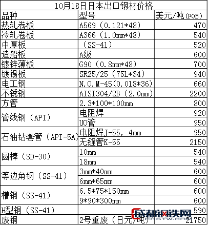 10月18日日本出口鋼材價格