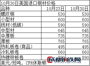 10月30日美國(guó)進(jìn)口鋼材價(jià)格