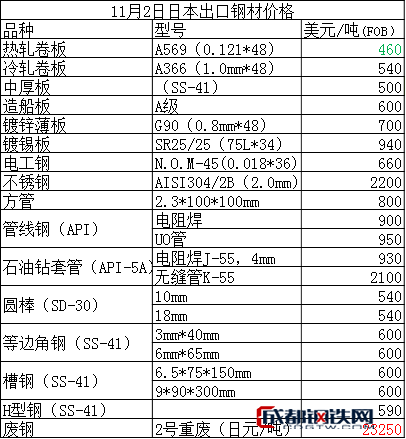 11月2日日本出口鋼材價格