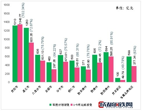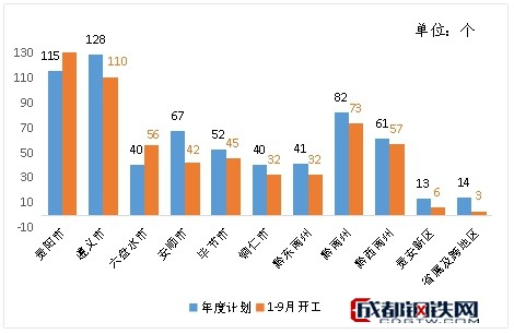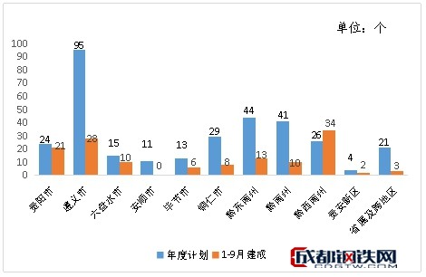 分地區(qū)看,貴陽(yáng)市完成投資1343.77億元、占年度計(jì)劃102.3%,遵義市完成投資920.35億元、占年度計(jì)劃72.9%,六盤水市完成投資501.13億元、占年度計(jì)劃78.8%,安順市完成投資297.36億元、占年度計(jì)劃64.2%,畢節(jié)市完成投資473.81億元、占年度計(jì)劃75.6%,銅仁市完成投資343.61億元、占年度計(jì)劃68.31%,黔東南州完成投資295.90億元、占年度計(jì)劃79.8%,黔南州完成投資458.45億元、占年度計(jì)劃72.2%,黔西南州完成投資596.25億元、占年度計(jì)劃85.9%,貴安新區(qū)完成投資49.79億元、占年度計(jì)劃49.8%,省屬及跨地區(qū)項(xiàng)目完成投資377.34億元、占年度計(jì)劃63%。完成投資進(jìn)度占年度計(jì)劃比例前三位的市州是貴陽(yáng)市、黔西南州、黔東南州,分別占年度計(jì)劃的102.3%、85.9%、79.8%。