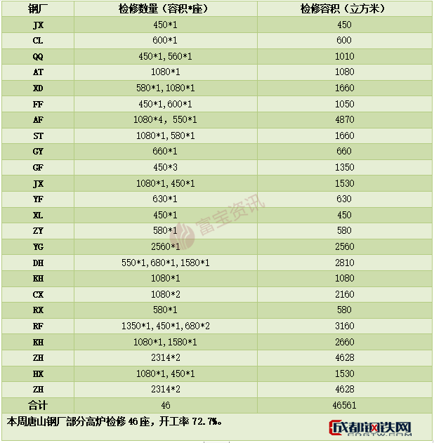 本周唐山部分鋼廠高爐檢修46座,開工率72.7%。