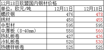 12月18日歐盟國內(nèi)鋼材價(jià)格