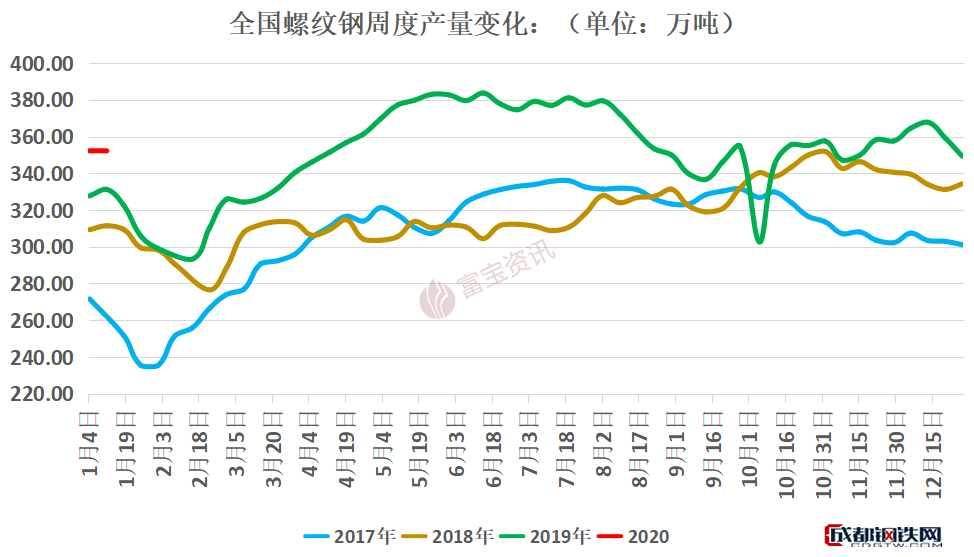 圖3:全國螺紋鋼周度產(chǎn)量變化走勢圖(單位:萬噸)