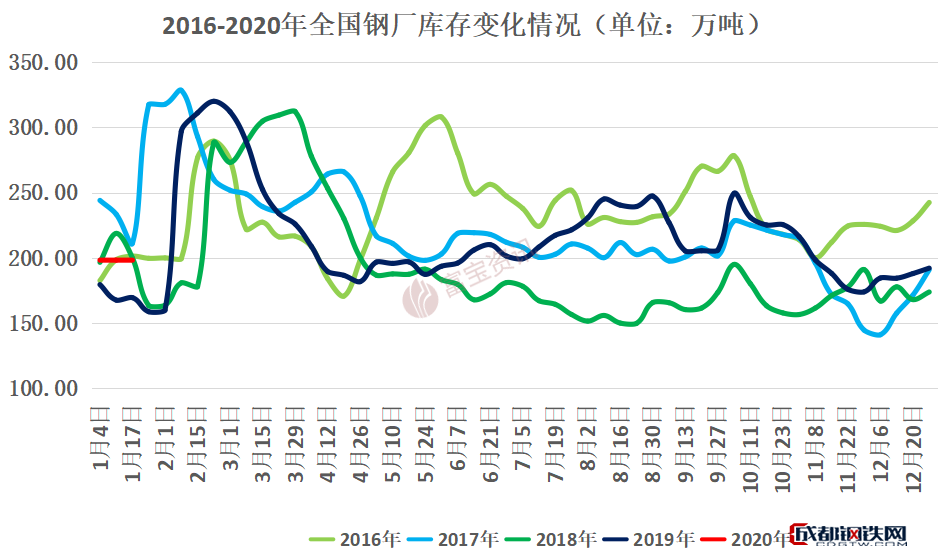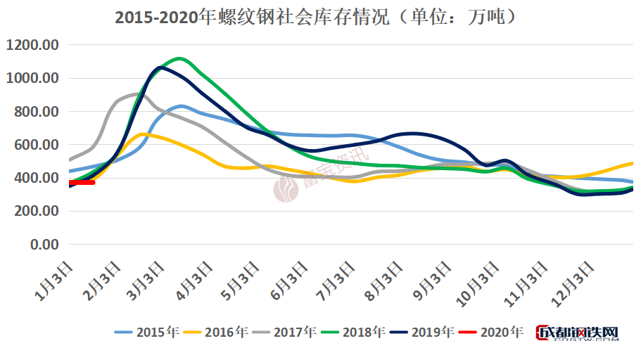 圖1:螺紋鋼2015年—2020年每周庫存總量走勢圖(單位:萬噸)