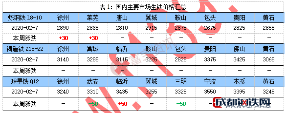 廣東地區(qū)部分鐵廠售價上調。鑄造鐵、球墨鐵方面,下游多未開工,鐵廠鮮有成交,部分廠家報價下調,目前市場基本處于有價無市狀態(tài),因運輸受限,在產(chǎn)鐵廠原料逐漸減少,河北、山東部分鐵廠后期有停產(chǎn)、減產(chǎn)可能,山東個別球墨鐵廠報價上調。各地生鐵