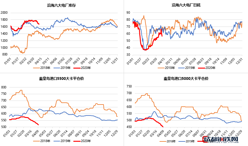 下游方面,當(dāng)前沿海電廠庫(kù)存居高難下,日耗窄幅震蕩,而重點(diǎn)電廠主動(dòng)降庫(kù)雖顯成效,但傳統(tǒng)電煤淡季之下各終端需求難言樂(lè)觀,后市港口煤價(jià)仍有下行壓力。截止3月29日全國(guó)重點(diǎn)電廠存煤7592萬(wàn)噸,日供299萬(wàn)噸,日耗347萬(wàn)噸,可用天數(shù)為23天;4月8日沿海五大電廠庫(kù)存1478.69萬(wàn)噸,日耗45.01萬(wàn)噸,可用天數(shù)32.9天。
