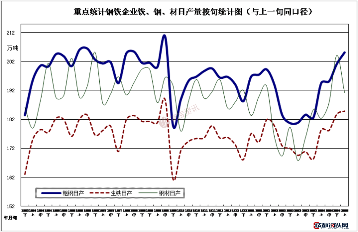 鋼材1913.14萬(wàn)噸、焦炭321.52萬(wàn)噸。本月重點(diǎn)統(tǒng)計(jì)鋼鐵企業(yè)累計(jì)平均日產(chǎn)粗鋼205.17萬(wàn)噸,環(huán)比增長(zhǎng)5.44%、同比增長(zhǎng)0.28%;生鐵184.87萬(wàn)噸,環(huán)比增長(zhǎng)3.64%、同比增長(zhǎng)1.34%;鋼材191.31萬(wàn)噸,環(huán)比增長(zhǎng)4.93%、同比增長(zhǎng)0.95%。