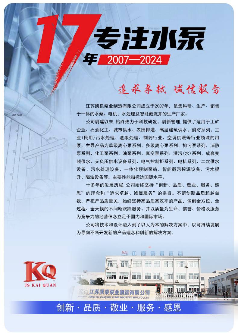 江蘇凱泉泵業(yè)制造有限公司成立于2007年,是集科研、生產(chǎn)、銷售于一體的水泵、電機、水處理及智能截流井的生產(chǎn)廠家。